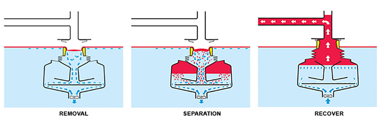 The Ultra-SurfCleaner technology is based on gravimetric separation, collecting both the carrier fluid and the top layer substance – allowing up to 100% separation of the top layer substance, and a separation capacity of 8,000 liters (2,113 gal) per hour.